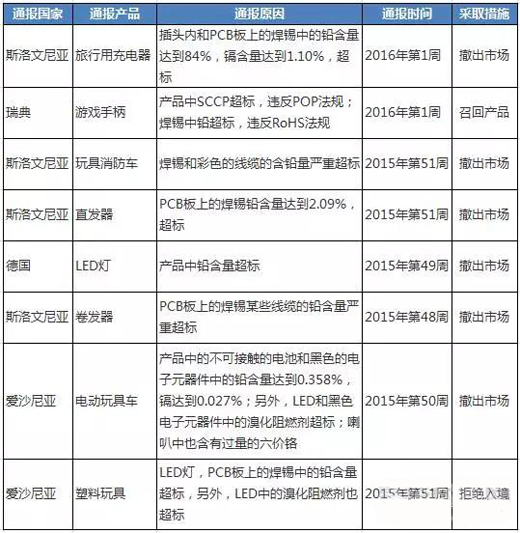 自2015年12月至今,歐盟成員國(guó)在市場(chǎng)執(zhí)法活動(dòng)中加強(qiáng)對(duì)電子電氣產(chǎn)品RoHS符合性的檢查,并通過(guò)歐盟非食品類消費(fèi)品快速預(yù)警系統(tǒng)(RAPEX)頻繁通報(bào)RoHS違規(guī)產(chǎn)品,且通報(bào)的產(chǎn)品呈現(xiàn)出明顯的多元化特點(diǎn),部分RoHS違規(guī)產(chǎn)品見(jiàn)下表: