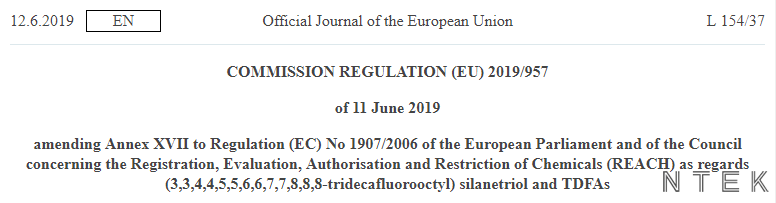 2019年6月12日,歐盟官方公報(bào)發(fā)布指令(EU)2019/957,修訂RAECH法規(guī)的附件XVII有關(guān)硅烷三醇及其一取代、二取代或三取代-氧-烷基衍生物(TDFAs)的條例。該指令直接適用于成員國(guó),將于2019年7月1日起正式生效。