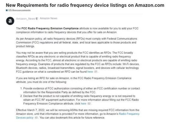 近日,亞馬遜又出新政策了,有關(guān)Amazon.com美國(guó)站銷(xiāo)售的射頻設(shè)備(RFD)必須滿(mǎn)足FCC合規(guī)新要求,強(qiáng)調(diào)了所有射頻設(shè)備(RFD)必須在2022年3月7日前提供FCC合規(guī)證明和信息,否則將會(huì)下架處理