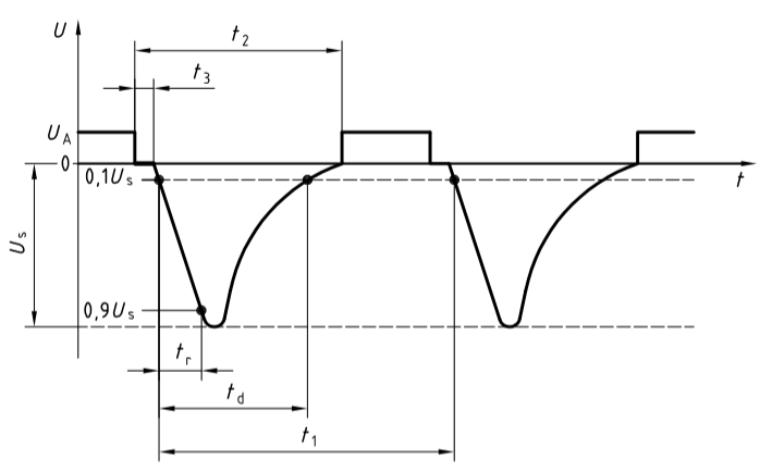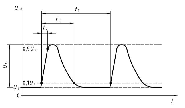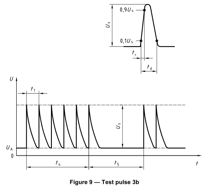 ISO7637系列標準中,規格了安裝在乘用車及12V電氣系統的輕型商用車或24V電氣系統的商用車上設備的傳導電瞬態電磁兼容性測試的臺架試驗,包括瞬態注入和測量,這些脈沖都是沿著電源線進行電瞬態傳導的。脈沖1產生于電感負載的電源松開的瞬間。它將影響直接與這個電感性負載并聯在一起的設備的工作。脈沖1的波形如下圖所示:脈沖1(P1)的內阻較大(10Ω~50Ω),電壓較高(幾十~幾百伏)、前沿較快(微秒級)和寬度較大(毫秒級)的負脈沖。在整個ISO7637-2標準里屬于中等速度和中等能量的脈沖干擾。