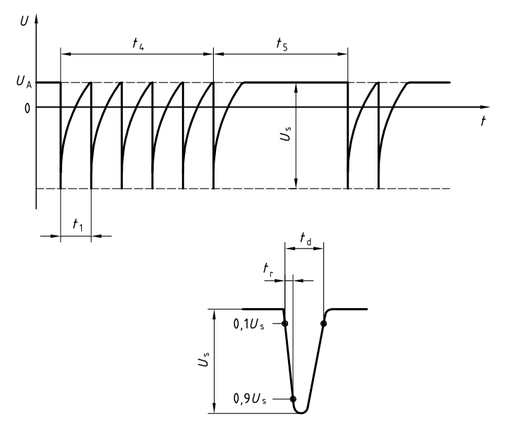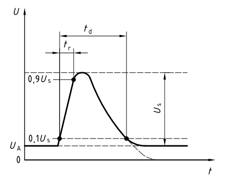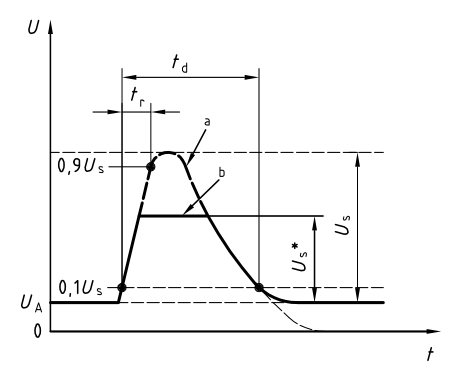 試驗脈沖P5(拋負載)發生在蓄電池被松開的瞬間,而這時間交流發電機正在對蓄電池充電,與此同時,其他的負載仍接在交流發電機的電路上。脈沖P5的波形如下圖所示:卸載脈沖的幅度取決于交流發電機的速度,以及在電池松開瞬間交流發電機的勵磁情況。卸載脈沖的持續時間主要取決于勵磁線路的時間常數,以及脈沖的幅度。