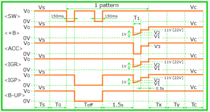 當我們啟動汽車,啟動的順序是:未啟動時,車內的應急燈、時鐘等模塊,通過+B電路與車內蓄電池連接,長期供電;當鑰匙插入汽車,首先接通的是ACC(附件)電路,ACC電路給部分車載模塊供電,如視聽系統,儀表燈,燈光等,此時,除了發動機不轉、空調不能用外,車內的其他模塊基本都可以使用了。最后接通的是IG電路,此時汽車發動機啟動,汽車發電機和空調也同時開啟。所以一般的汽車里,至少都有+B、ACC、IG三套供電電路。在實際工作時,多套電路會發生互相影響,某電路的啟停或快速變化,由于電路中的感性負載、容性負載以及線束分布電容、分布電感的作用,會產生出各種各樣的脈沖信號,這些信號有可能會干擾到連接到這些電路的其它模塊的正常工作。而且,對于需要2套及以上的電路同時供電的用電模塊來說(比如行車記錄儀等),在模擬各路電源電路的波動或瞬斷時,不但要給車載模塊的各個供電端提供單獨的復雜的電壓波形外,還要解決各個供電電路通道的同步問題。