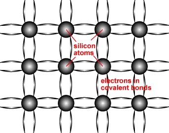我們目前用得最多的半導(dǎo)體材料,比如硅(Si),是Ⅳ族元素,本身最外層電子為4,可以形成穩(wěn)定的晶格結(jié)構(gòu),因此它本身是無法導(dǎo)電的,如下圖所示,所有電子和原子核都被牢牢束縛在穩(wěn)定的結(jié)構(gòu)中出不來,所以沒有自由移動的電荷。