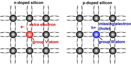 而當(dāng)材料中摻雜了其他元素,比如說Ⅲ族或者Ⅴ族元素,甚至其他元素,取代了晶格中的位置。摻雜Ⅴ族元素,結(jié)構(gòu)中就有了除了最外層4個以外的一個電子(即多數(shù)載流子為電子),摻雜了Ⅲ族元素,結(jié)構(gòu)中就缺了一個電子構(gòu)成穩(wěn)定結(jié)構(gòu),即形成一個空穴(即多數(shù)載流子為空穴)。如下圖所示,左圖為摻雜Ⅴ族元素的示意圖,Ⅴ族元素最外層有五個電子,四個電子參與形成共價鍵,因此還剩余一個電子;右圖為摻雜Ⅲ族元素的示意圖,Ⅲ族元素最外層有三個電子,只有三個電子用于形成共價鍵,因此留下一個空穴。為了方便,可以直接將電子和空穴理解成負(fù)電荷和正電荷。