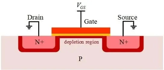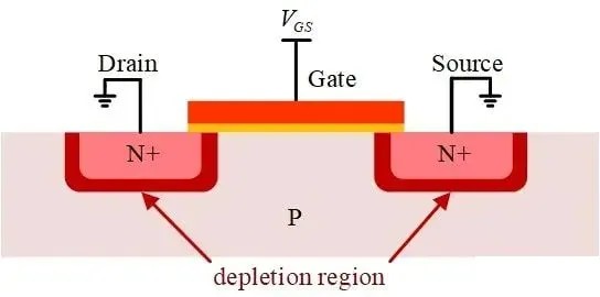 以平面增強(qiáng)型N溝道MOSFET為例,基本結(jié)構(gòu)如下圖所示。可以看到,從左到右為NPN的摻雜,在擴(kuò)散作用下,會自然形成像圖中所示的深紅色的耗盡區(qū)(depletion region),根據(jù)前面所述,耗盡區(qū)是不能導(dǎo)電的,因此漏極(Drain)到源極(Source)在未加外加電場的時是斷開的,因此該結(jié)構(gòu)是Normal off的結(jié)構(gòu)。