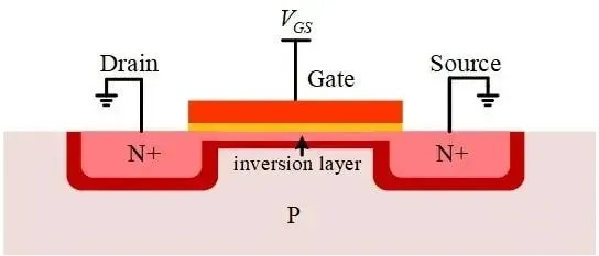 而施加的電壓足夠高時,將把耗盡層內(nèi)的空穴進(jìn)一步驅(qū)趕,并吸引電子往上表面運(yùn)動,在上表面堆積可以導(dǎo)電的電子,從而形成N型半導(dǎo)體,從而形成反型層(Inversion layer, 之所以叫反型層是指在電場作用下,該區(qū)域內(nèi)的自由載流子與摻雜形成的半導(dǎo)體載流子相反)。一般我們將開始形成反型層時施加的電壓稱為門檻電壓。反型層也就是我們后面要提到的導(dǎo)電溝道(沿水平方向形成導(dǎo)電溝道)。