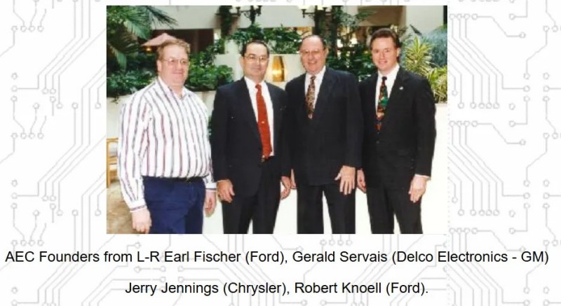 1994 年,克萊斯勒、福特和通用汽車三大主機(jī)廠為建立一套通用的零件資質(zhì)及質(zhì)量系統(tǒng)標(biāo)準(zhǔn)而設(shè)立了汽車電子委員會(huì) AEC(Automotive Electronics Council),符合AEC規(guī)范的零部件均可被三家車廠同時(shí)采用。此舉推動(dòng)了汽車零部件通用性的實(shí)施,為車載電子市場(chǎng)的快速增長(zhǎng)奠定基礎(chǔ)。目前AEC會(huì)員遍及全球各大汽車廠與汽車電子和半導(dǎo)體廠商,AEC-Q為AEC組織所制訂的車用可靠性測(cè)試標(biāo)準(zhǔn)。