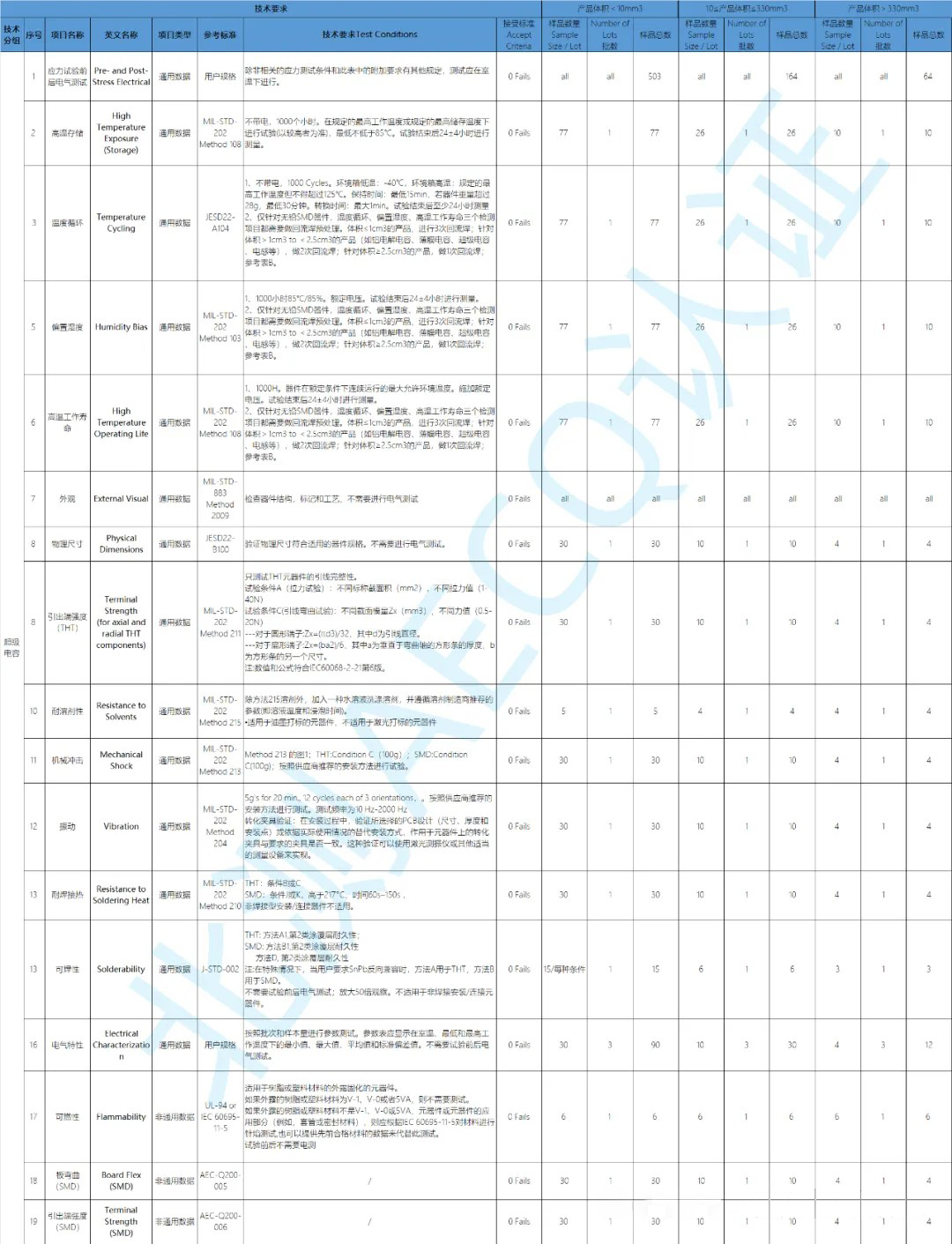 超級電容器AEC-Q200認證共17項測試,根據產品尺寸重新定義測試樣品數量,新標準按照<10cm3、10cm3≤x≤330cm3、>330cm3三種規格確認測試樣品數量,尺寸越大需要的樣品數量越少;以溫度循環為例,產品規格<10cm3需要77個樣品,產品規格10cm3≤x≤330cm3需要26個樣品,產品規格>330cm3僅需要10個樣品。