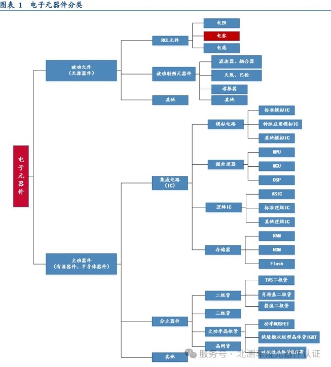 電容器是電子線路中必不可少的基礎元件,與電阻、電感并稱三大被動元件。根據工作特點,電子元器件可以分為主動器件和被動元件:主動器件(又稱有源器件、半導體器件)指在工作時內部有電源存在的電子元器件;被動元件(又稱無源器件)指工作時內部沒有任何形式電源的電子元器件,具備自身不消耗電能、或把電能轉變為不同形式的能量、只需輸入信號無需外加電源就能工作等特性。電容器是一種用于儲存電量和電能的被動元件,與電阻、電感并稱三大被動元件,是最常用的電子元件之一。
