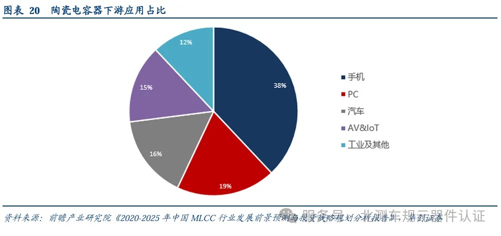陶瓷電容器下游應用廣泛,覆蓋軍工、工業和消費領域,幾乎所有電路中都有陶瓷電容器。多層陶瓷電容器作為電子線路中必不可少的基礎電子元器件,下游應用領域廣泛,包含航空航天、兵器等軍工領域,工控設備、醫療電子、汽車電子、精密儀表等工業領域以及消費類電子產品等領域。根據前瞻產業研究院數據,消費類領域占據絕大部分的市場份額,高端消費和一般消費領域合計占MLCC市場份額的73%。