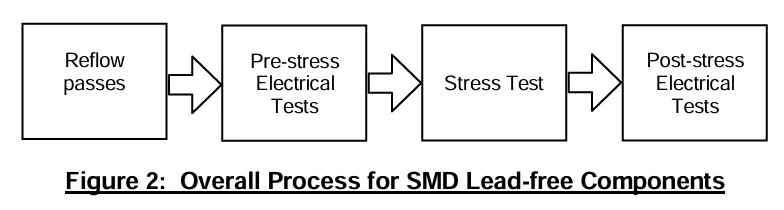 對于SMD無鉛元件,需要滿足特殊質量和AEC-Q005中規定了當使用無鉛(無鉛)工藝時出現的可靠性問題:無鉛測試要求。無鉛加工中使用的材料包括端接鍍層以及板連接(焊料)。這些材料通常需要更高的板連接溫度產生可接受的焊點質量和可靠性。這次AEC-Q200改版規范中也說明,為確保車用無鉛被動組件不會因為經過無鉛回焊(Reflow)后失效異常,因此定義部分可靠度測試項目需先完成Reflow之后,才可進行下一步驟。除此之外,對于尺寸不同的組件也規范了不同的測試次數。