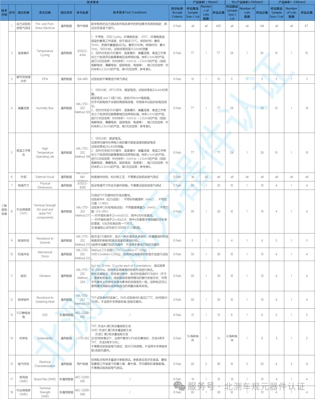 陶瓷電容器AEC-Q200認證共17項測試,根據產品尺寸重新定義測試樣品數量,新標準按照<10cm3、10cm3≤x≤330cm3、>330cm3三種規格確認測試樣品數量,尺寸越大需要的樣品數量越少;