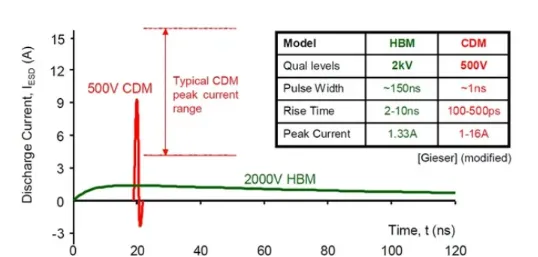 CDM(Charged Device Model)作為一種獨(dú)特的ESD(Electrostatic Discharge)模擬方式,與HBM(Human Body Model)和MM(Machine Model)有所區(qū)別。此模型專(zhuān)注于模擬電子設(shè)備在生產(chǎn)或物流環(huán)節(jié)中積累的靜電,在接觸地面或其他導(dǎo)電物體時(shí)引發(fā)的快速電荷釋放現(xiàn)象。CDM放電事件的特點(diǎn)是極其迅速的電流上升階段,通常在0.1至0.5納秒之間,整個(gè)放電過(guò)程大約持續(xù)6至8納秒,其電流峰值相較于HBM模型在相同ESD條件下可達(dá)到數(shù)倍之高。