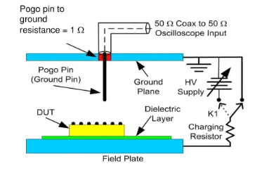 CDM測(cè)試裝置主要由一個(gè)與高壓電源相連的充電板Field Plate和一個(gè)接地的Pogo pin構(gòu)成,Pogo pin能夠在待測(cè)IC(DUT)的引腳間移動(dòng),以模擬實(shí)際的ESD事件。圖1展示了實(shí)際的測(cè)試模塊,而圖2則為等效電路圖,其中CDUT代表DUT與場(chǎng)板之間的電容,CDG代表DUT與地平面之間的電容,CFG代表場(chǎng)板與地平面之間的電容。