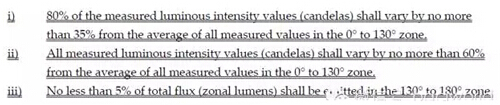 規(guī)范了全向燈光分布的標準要求,增加了“全向燈0-130環(huán)帶內(nèi)光強值與所有平均值的變化不超過60%”,并且附上了自動計算公式。此要求來源于“CEC Title 20 15-Day Notice”,如下圖所示。