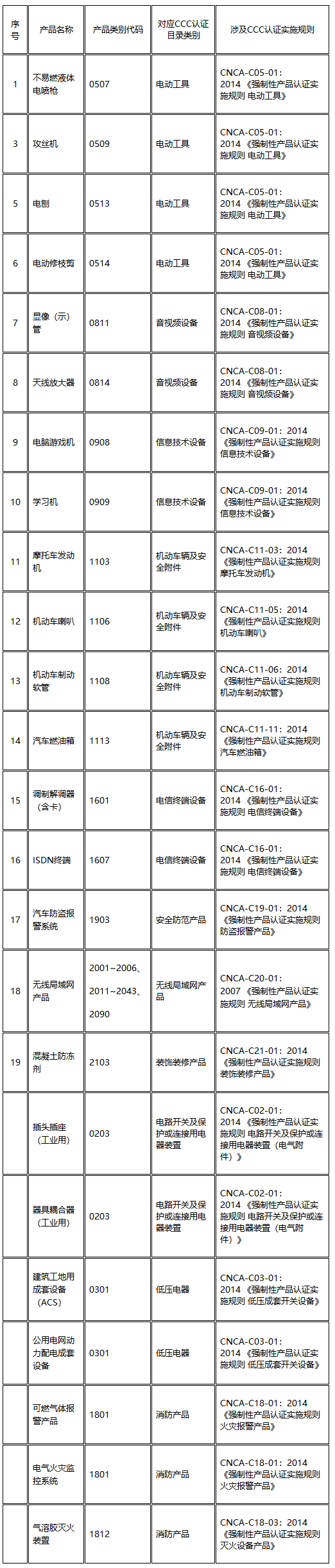 注:未標注序號的產品在CCC產品目錄中屬于1種產品下的部分產品。