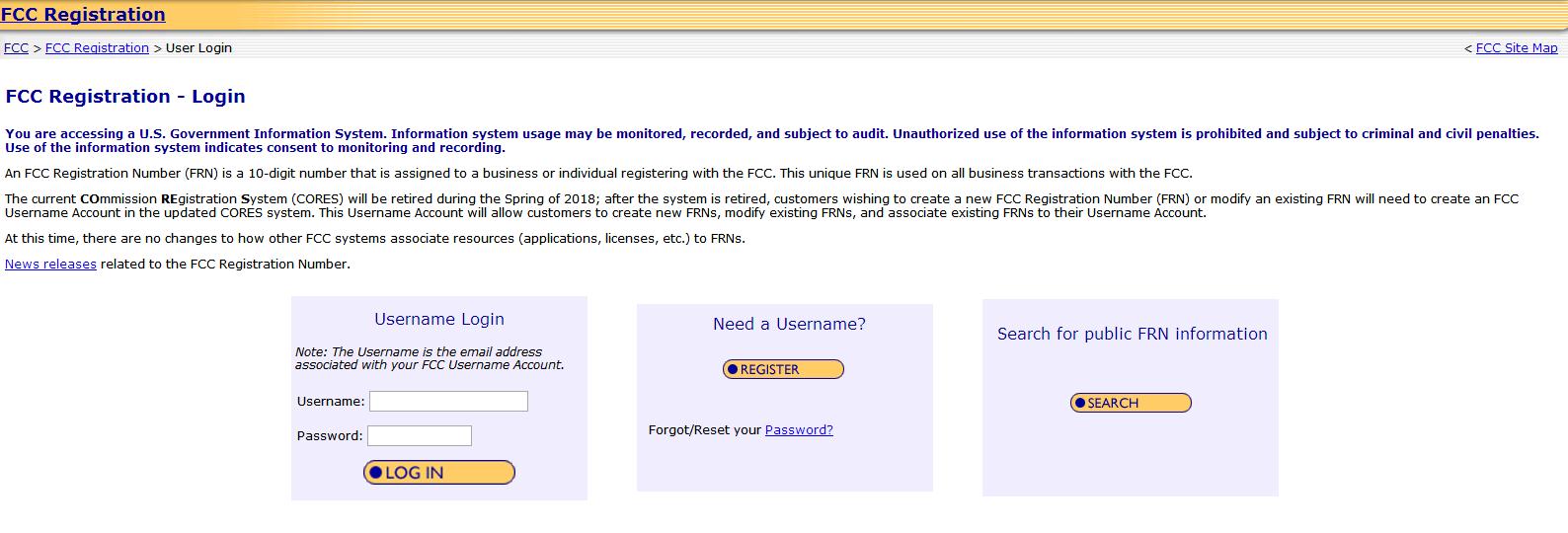 目前的CO mmission RE gistration S ystem (CORES )將在2018年春季退役; 系統退役后,希望創建新的FCC注冊號(FRN)或修改現有FRN的客戶需要在更新的CORES系統中創建FCC用戶名帳戶。此用戶名帳戶將允許客戶創建新FRN,修改現有FRN,并將現有FRN與其用戶名帳戶相關聯。