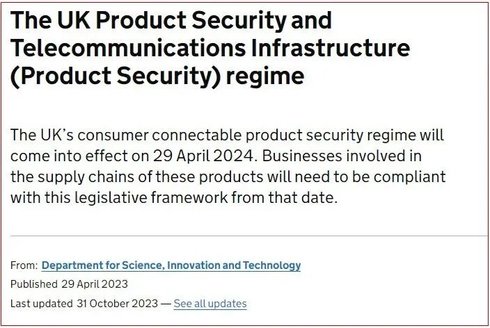 根據英國在2023年4月29日頒布的《產品安全和電信基礎設施法案2023》,英國將在2024年4月29日起開始強制執行聯網消費設備的網絡安全要求,適用于英格蘭、蘇格蘭、威爾士、北愛爾蘭。截止目前,距離現在只有短短3個多月時間了,各大出口英國市場的制造廠商需要盡快完成PSTI認證,以確保順利進入英國市場。