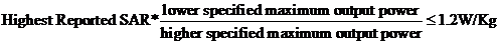 時,則規定功率較小的那一段不需要進行測試。(舉個例子測試的U-NII-1段的最大報告SAR值為1.4W/Kg,U-NII-1段規定的功率為250mW而U-NII-2A段的是規定功率為200mW,那么adjusted SAR=1.4*200/250=1.12W/Kg<1.2W/Kg,所以U-NII-2A段不需要測試。)反之,兩段都需要分開進行單獨測試。